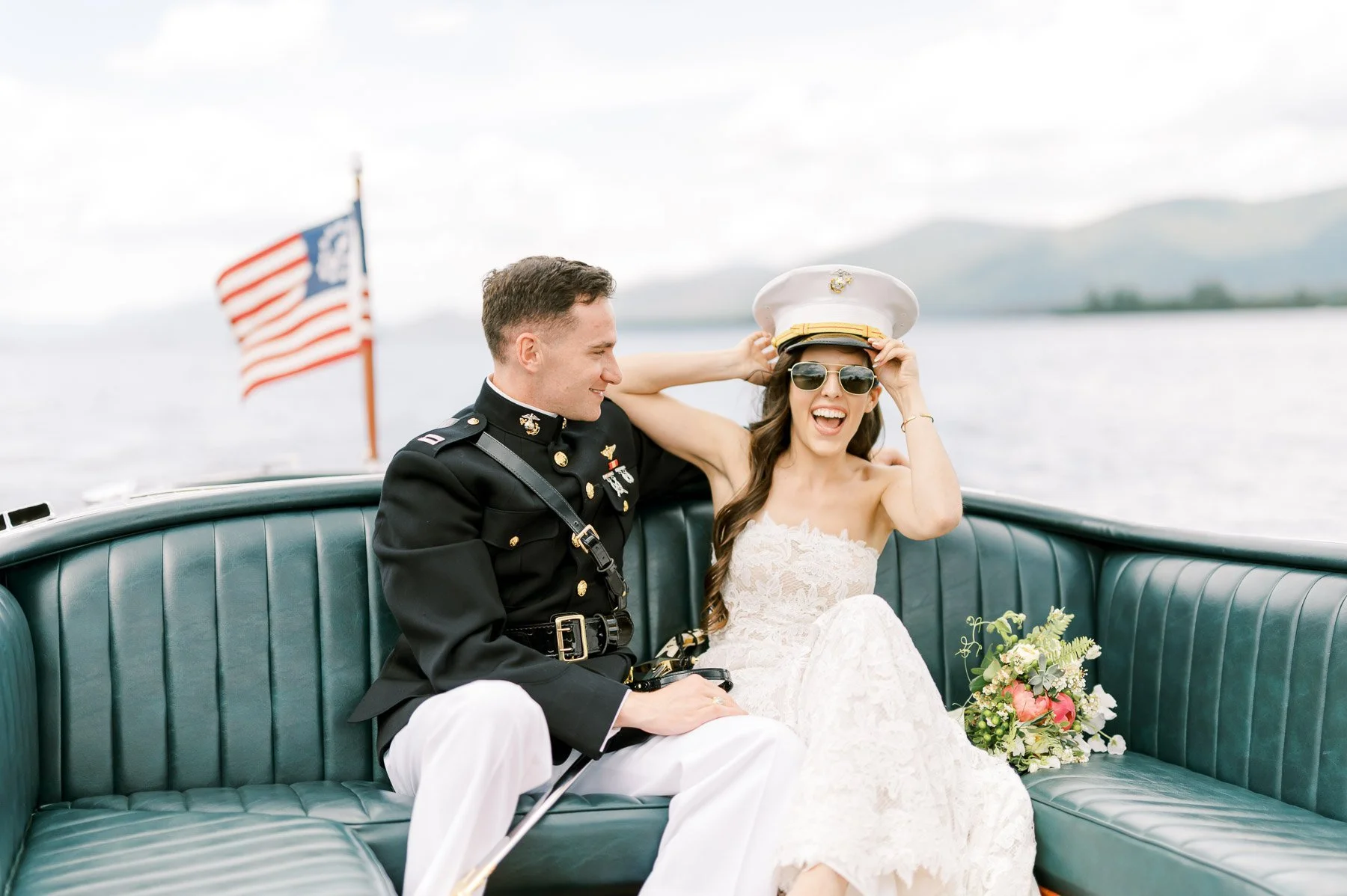 The wedding at The Inn at Erlowest in 2022 was a stunning celebration set against the breathtaking backdrop of Lake George. The military groom, looking sharp in his crisp uniform, stood proudly beside his beautiful bride, who wore a graceful gown from The Dress Theory in San Diego. Pops of coral throughout the floral arrangements brought a warm and vibrant energy to the event and beautifully complemented the natural beauty of the venue.